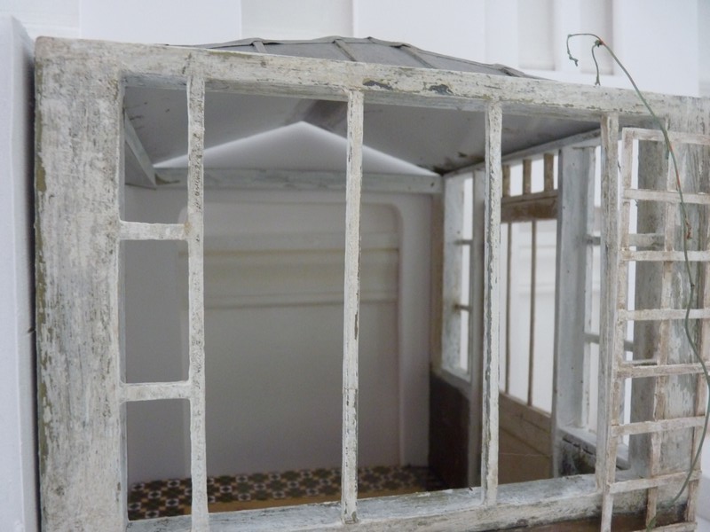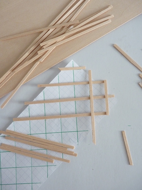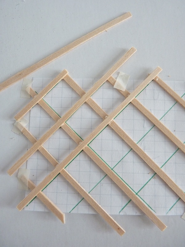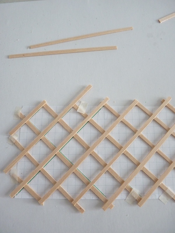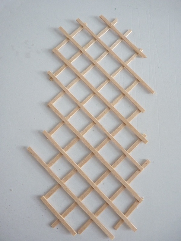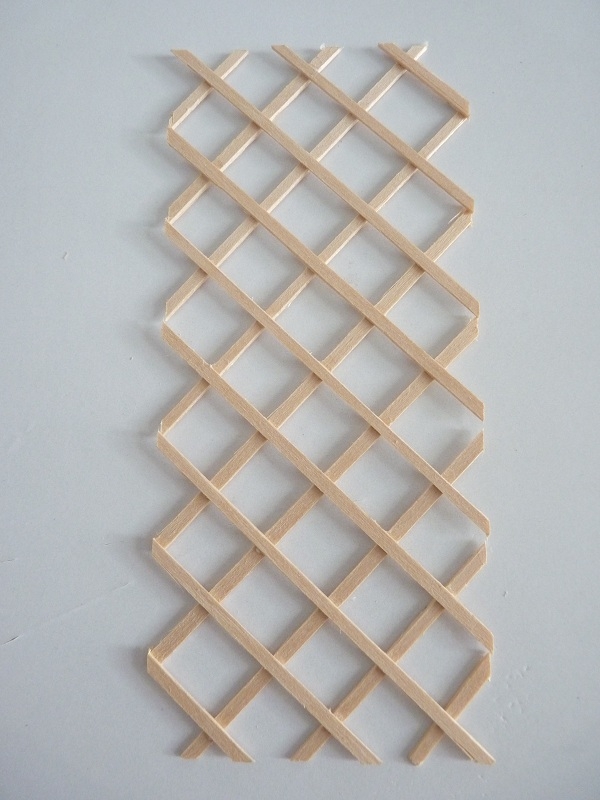 Pour faire le treillage, j'ai recoupé des lattes d'environ 2 mm de large dans une planchette de tilleul d'1 mm d'épaisseur. J'en ferai probablement d'autres pour d'autres coins du jardin et de la cour. |