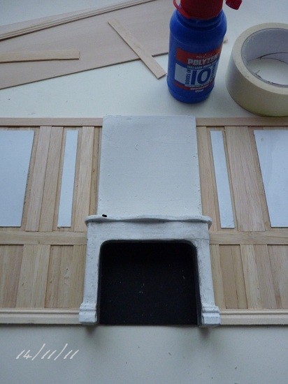 J'ai prévu les passages des fils électriques pour les appliques qui seront de part et d'autre de la cheminée (je fais les trous à la vrille, ça va très bien), il y aura également un lustre fait-maison, si tout va bien...).